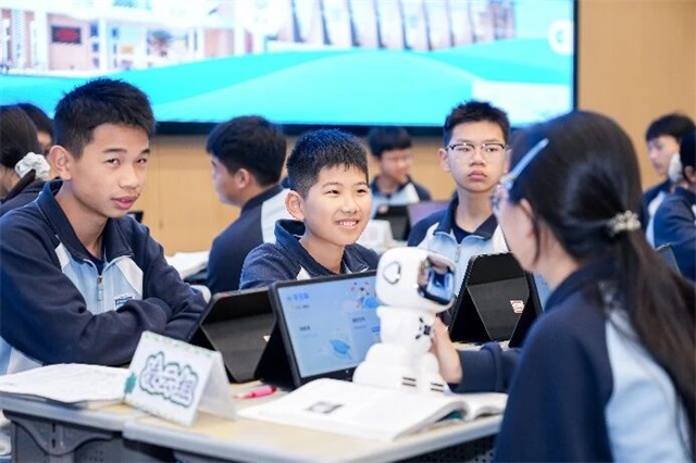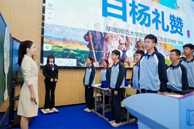 本届论坛中,有一位极其特别的嘉宾——教学机器人“数智I老师”。华附河源HJC黄金城学校的陈苏老师和“I老师”携手,为学校八(3)班的同学们开展了一堂别开生面的AI教学实践示范课《白杨礼赞》。